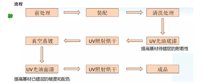 真空蒸鍍有三層:底漆層(6~12um)+鍍膜層(1~2um)+面漆層(10um),將基材表面雜質(zhì)、灰塵等用布擦拭干凈,提高噴射良率。將基材裝配在專用掛具上,用以固定于流水線上,并按設(shè)計要求實(shí)現(xiàn)外觀和功能的遮鍍。由于基材是塑膠件,在注塑時候會殘留空氣泡,有機(jī)氣體,塑膠表面不夠平整,直接蒸鍍吸附差且不光滑平整,涂一層底漆會提高鍍層的附著性且表面光滑平整效果好。將掛件裝配于真空容器內(nèi),加熱,實(shí)現(xiàn)蒸鍍。
